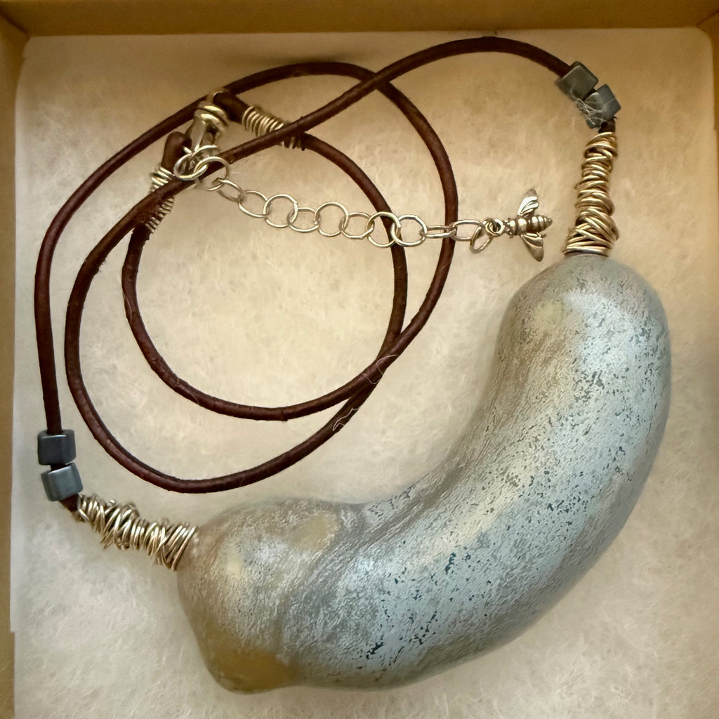 This Puffy Cheeto snack is painstakingly coated in many layers of porcelain clay, fired, then glazed in a rich mottled blue glaze. This one's especially special with its little blurp of glaze! Deep wine colored leather cord with just a bit of sheen ends with free-form silver wire wraps, glass cubed beads and lobster claw clasp. Need a bit more length...we include an extension chain with in added bee charm for luck! Exclusive. L 20"